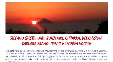 STEFANO SALETTI: OUD, BOUZOUKI, CHITARRA, PERCUSSIONI BARBARA ERAMO: CANTO E TECNICA VOCALE Una settimana con i suoni e i sapori del Mediterraneo nello splendido scenario del mare della Calabria. Dalla polifonia corsa, sarda e siciliana alle voci dei Balcani, dal [...]